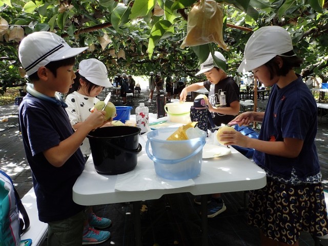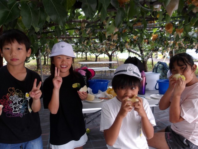 その後は、「なしっ子館」に行って、梨について学んだり食べ比べをしたりしました。色々な角度から梨について学びを深め、ここでも梨を堪能した子どもたちでした。20世紀梨と新甘泉と秋甘泉、どれが一番おいしかったかな?