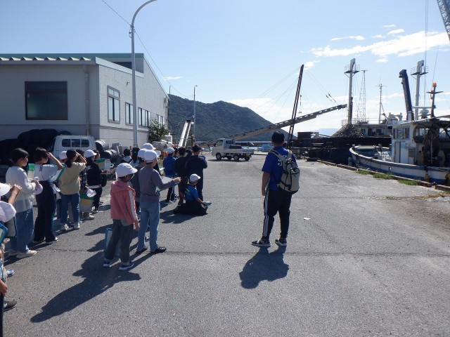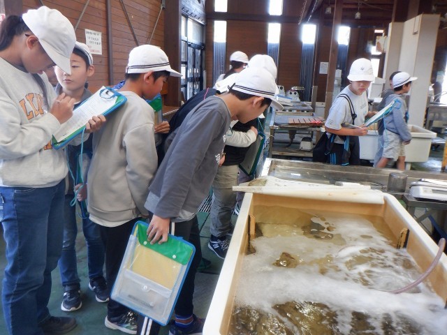 まず、「五味の市」で市場の見学をさせていただきました。はじめに漁業組合の方のお話を聞き、市場では、新鮮な魚を目の前で見せていただきました。ていねいな言葉で、熱心に質問したりメモを取ったりする姿がたくさん見られ、感心しました。