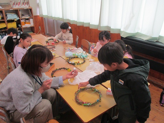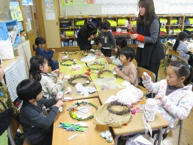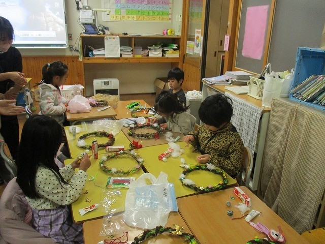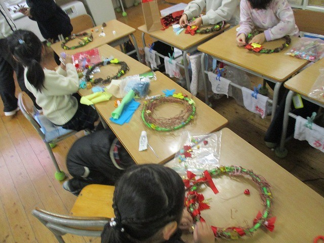 その輪に、自分で持ってきたり学校で用意した飾りをつけていきました。