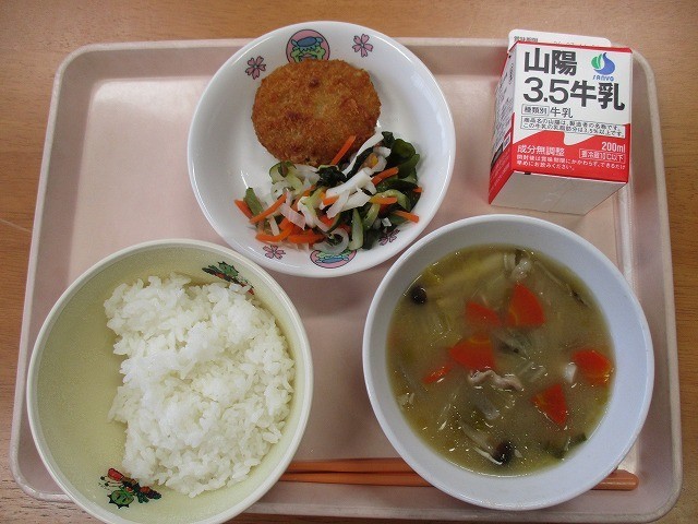 れんこんコロッケ、わかめときゅうりの酢の物、豚汁、それにごはんと牛乳でした。
