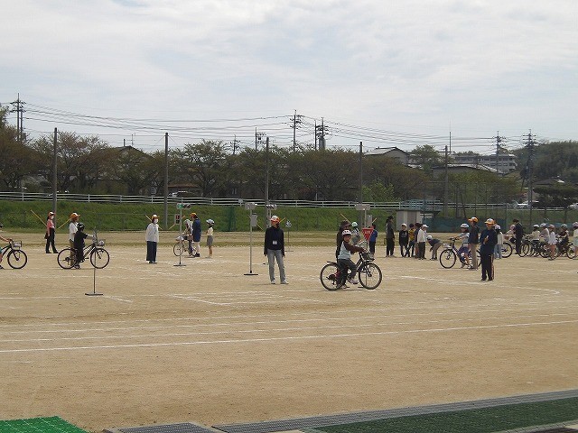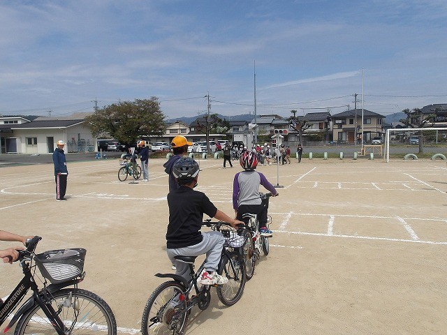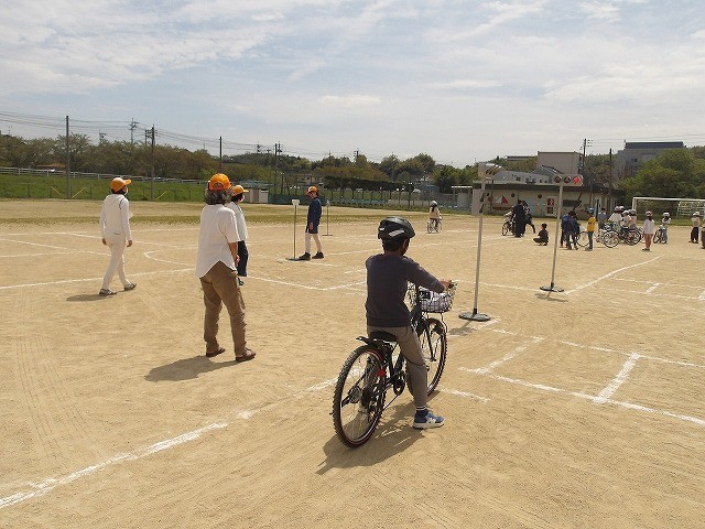 4年生は、自転車の乗り方です。ヘルメットをかぶって乗ること、停止の仕方や交差点の曲がり方など、実際に自転車に乗りながら勉強していました。