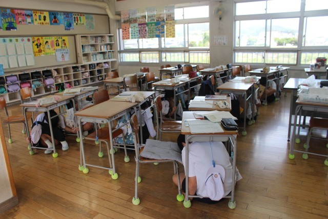 地震発生の放送を聞いてから避難開始の放送があるまで、多くの児童が机の下に隠れ静かに待つことができていました。