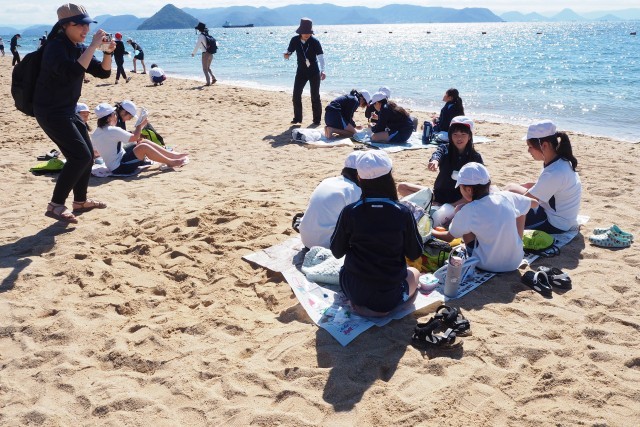 渋川の海岸に着いてすぐ子どもたちは海に向かってまっしぐら、そのまま波打ち際でお弁当を食べました。