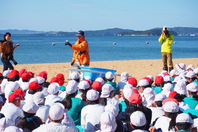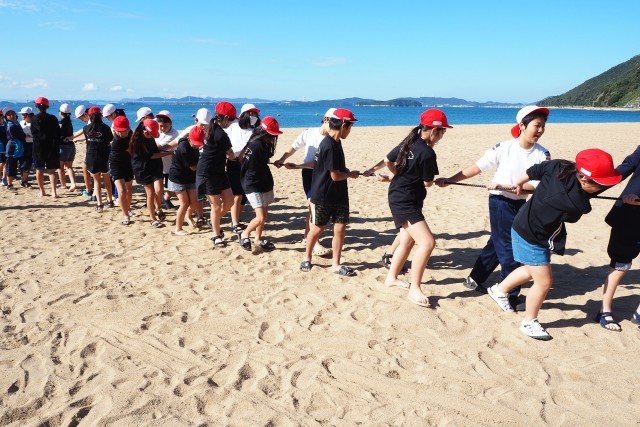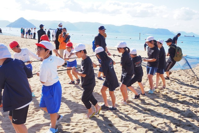 参加した各学校の子どもたちみんなが力を合わせて地引網を引っ張りました。