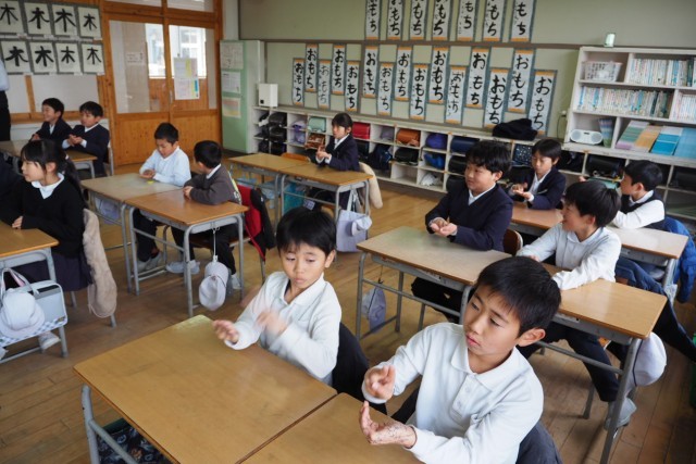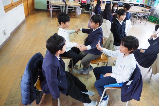 その後、子どもたちは自分の氏名を表す手話や指文字を教わり、実際に友達同士で伝え合いました。
