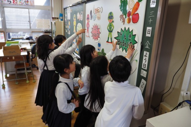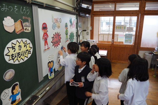 続く5校時目には食べ物の栄養についてお話をしていただき、食べ物の種類ごとに「ちからもりもりパワー」「からだぐんぐんパワー」「げんきるんるんパワー」といったそれぞれちがったパワーが身に着くことを教わりました。