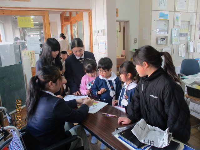 保護者の皆様に入学へ向けて必要な準備についてお話を聞いていただいている間、来年度入学する新1年生の子どもたちは5年生や1年生と一緒に体験入学をしました。
