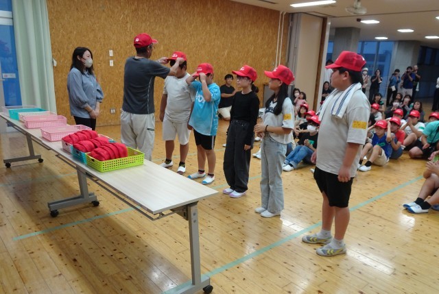 リーダーとしての力を身に付けたことにより、北小学校の伝統の赤色の「リーダー帽子」を受け取ることができました。