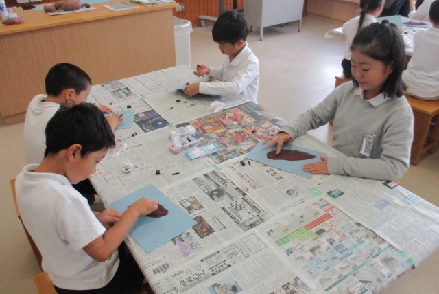 5色のパステルを使い、色を塗るごとにひとさし指でこすってグラデーションを作っていきました。
