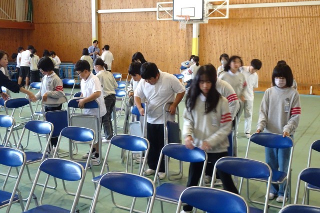 学習発表会に向けて、パワーアップタイムの時間に、5年生が体育館の椅子並べをしました。