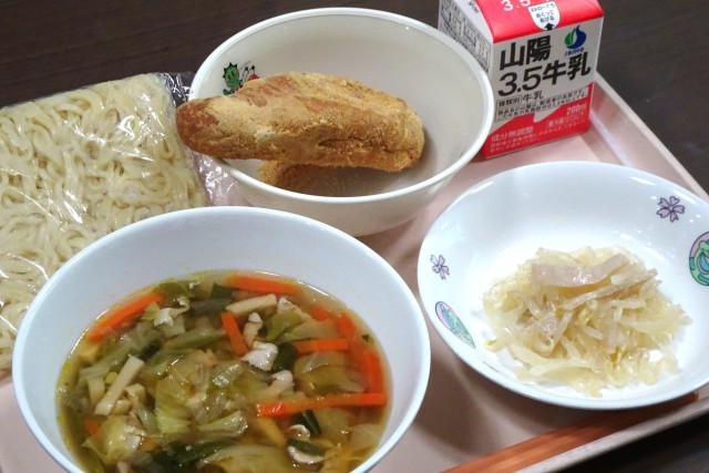 今日のメニューは「野菜たっぷりしょうゆラーメン」「糸寒天のあえ物」「ミニ揚げパン」でした。