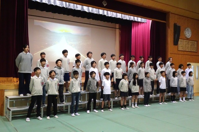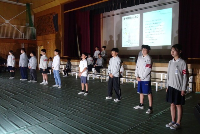 6年生が体育館で学習発表会の練習をしました。