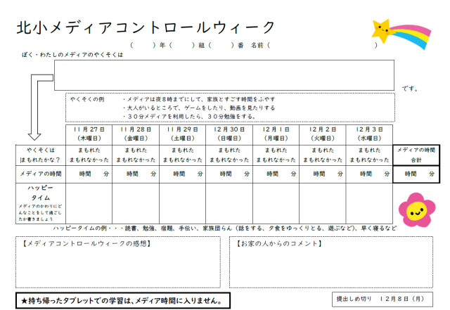 今日、11月27日(木)から12月3日(水)までは、「北小メディアコントロールウィーク」です。