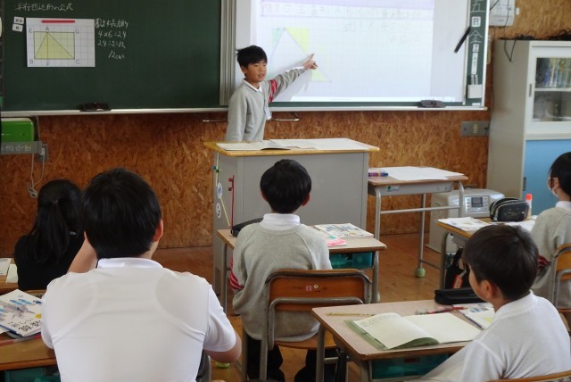 三角形が、今まで学習した長方形・正方形・平行四辺形の形にならないかと、既習事項を振り返り求め方を考えました。