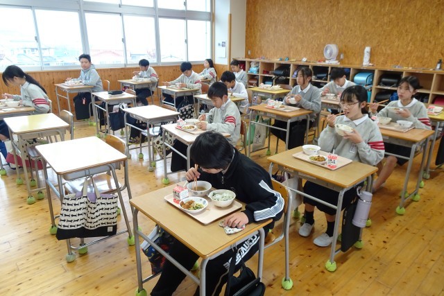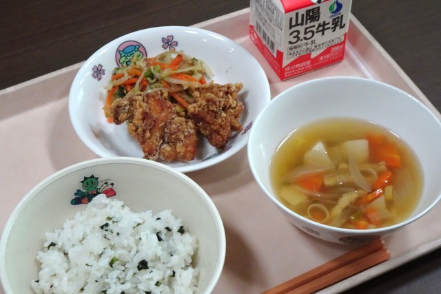 メニューは、「わかめごはん」「鶏肉のから揚げ」「おかかあえ」「田舎汁」でした。