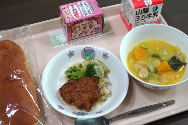 メニューは「コッペパン」「ツリーハンバーグ」「ツナサラダ」「豆乳かぼちゃスープ」「クリスマスケーキ」でした。
