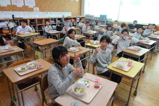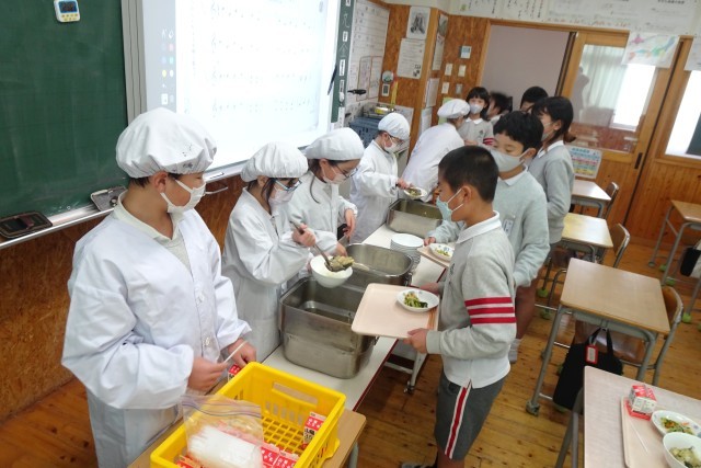 4年2組は、みんなで協力しながら上手に準備をして、「七草あんかけ丼」をおいしそうに食べていました。