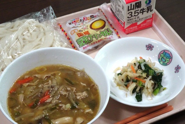 メニューは「みそうどん」「切干大根の酢の物」「セレクトデザート(プリンタルト/クリームソーダ風ゼリー)」でした。