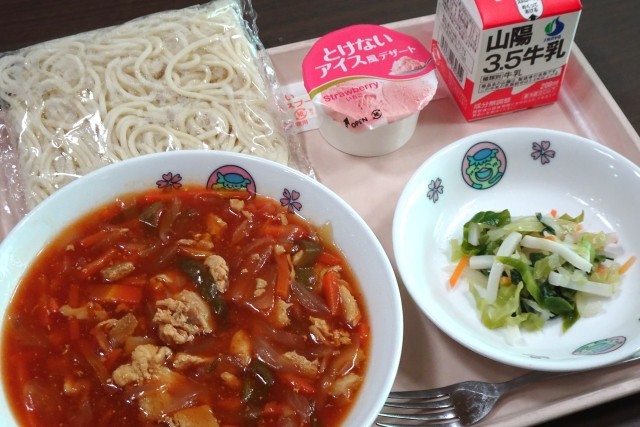 メニューは「ナポリタンソーススパゲティ」「小松菜とかまぼこのサラダ」「いちごのアイスデザート」でした。