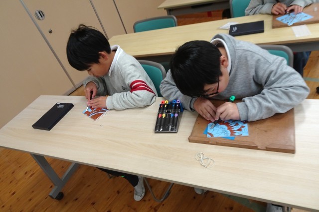 下絵を板に写し、この時間から彫刻刀で彫っていきました。