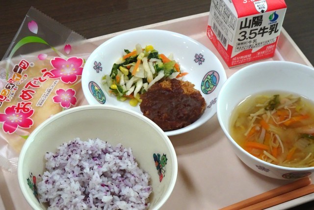 メニューは、「赤じそごはん」「みそカツ」「五色あえ」「すまし汁」「いちごのお祝いクレープ」でした。