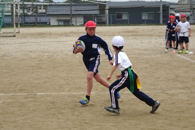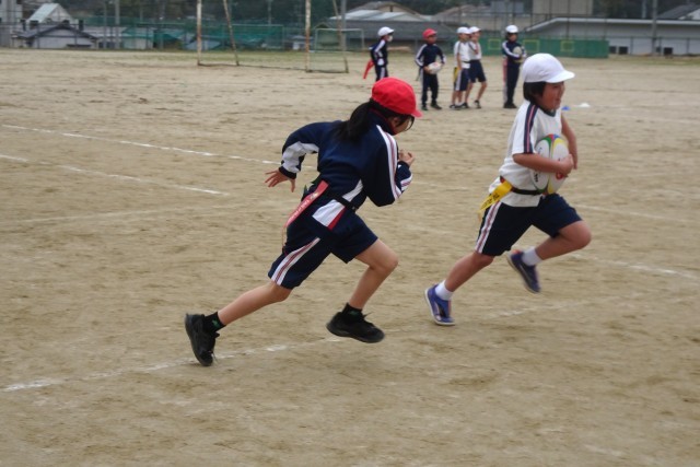 素早く相手をかわしてトライをしたり、相手を追いかけてタグを取ったり、楽しくゲームに取り組んでいました。