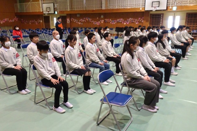 2校時には、卒業式に向けての心構えを伝え、座り方や起立、礼といった所作の練習をしました。
