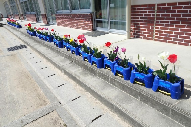 チューリップの花は、始業式に子どもたちが戻ってくることを、そして、入学式で新しい1年生が入学してくることを、待ち望んでいるかのようです。素敵な春の光景です。