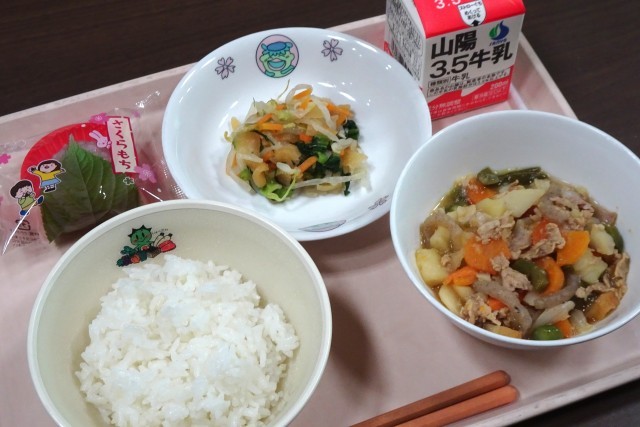 今年度の給食が始まりました。1年生にとっては、初めての給食でした。今日のメニューは、「豚じゃが」「福神あえ」「さくらもち」でした。