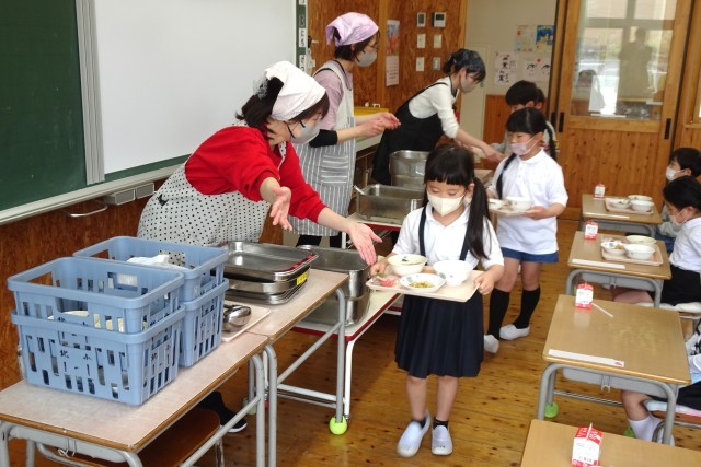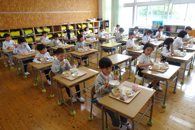 1年生は静かに給食の準備をして、初めての給食をおいしそうに食べていました。