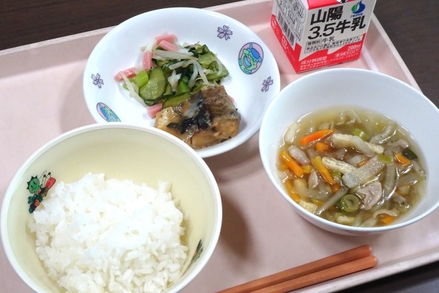 今日の給食は、「からだ想い減塩献立」でした。メニューは、「さばのみそ煮」「甘酢あえ」「沢煮椀」でした。