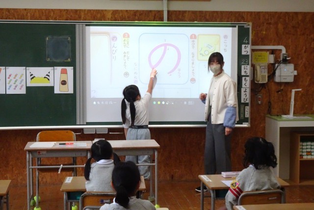 1年生は国語でひらがなの学習をしています。今日のひらがなは、「の」でした。