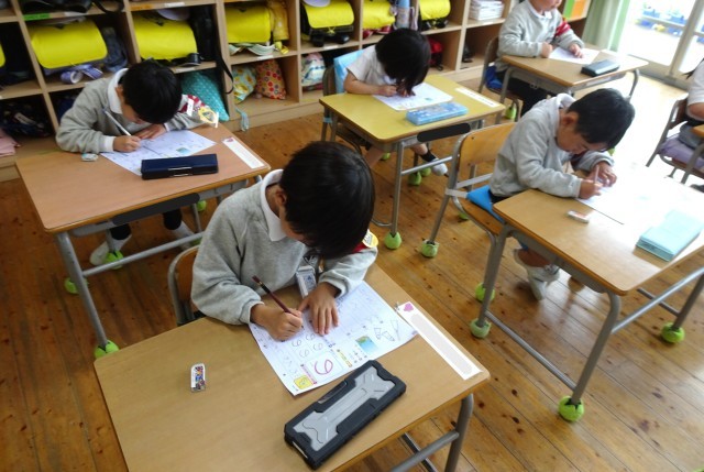 ひらがなは、1つのマスを4つに分け、4つの部屋を意識して書いています。気をつけるところを、子どもたち同士で見つけ合い、それを意識しながらていねいに練習しています。