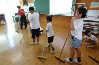 お昼休みの時間に、6年生が1年生と仲よく遊んでいます。1年生もうれしそうです