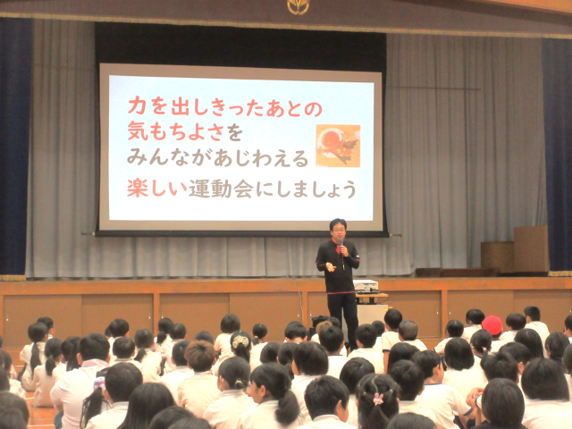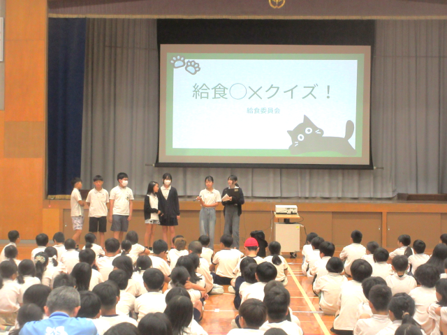 昨日は湯郷ベルの内田選手と福元選手が全校朝の会に参加してくれたことをお伝えしましたが、通常の会も行われています。学級代表の会を受けた9月のめあての反省に関わって担当の先生からお話があったり、いつものように委員会からの発表もあったりしました。今月は給食委員会がクイズを出してくれました。最後に10月18日(土)に開催される『ふれあいまつり』について6年生から告知がありました。今回6年生は鶴山小学校のふれあいまつりを盛り上げるために積極的に参加し様々な第物や出店を計画しています。この写真にあるチラシも6年生が作成しています。内田選手や福元選手も「すごいですね」と誉めて下さいました。保護者や地域の大人たちとつながり、ふれあいまつりを盛り上げようとしている6年生にご期待下さい。