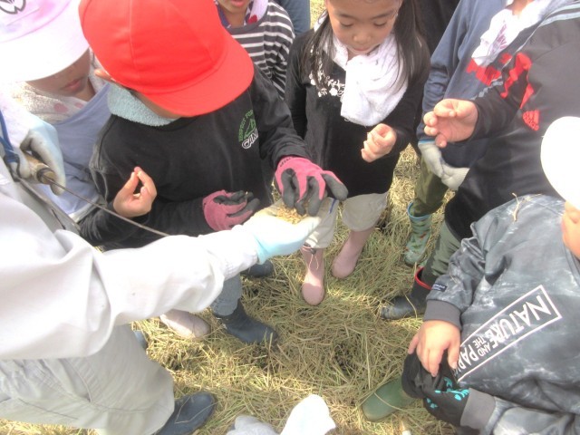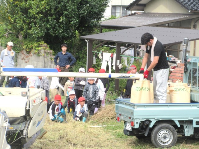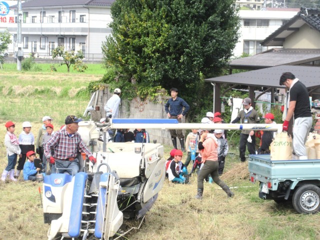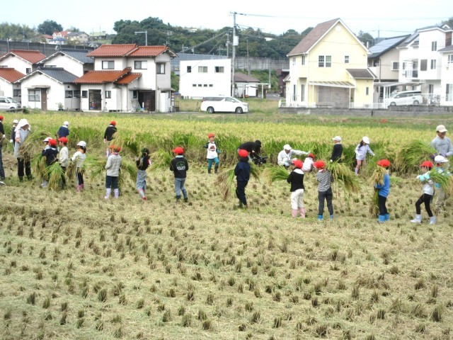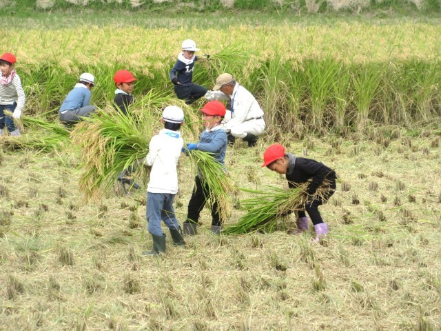 10/8(水)2年生が1学期の田植え体験に引き続き、いつもお世話になっている志戸部の寺阪さんの田んぼでお米の収穫(稲刈り)体験を行いました。子どもたちは寺阪様のお話や、JA職員の方の説明を聴いた後、鎌を使って稲を刈る作業に入っていきました。思いの外、子どもたちは上手に鎌を扱い稲を順調に刈ることができていました。普段なかなか経験することのできないことをやっている彼らの目は生き生きとしており、とても良い表情をしています。やはり「本物の体験に勝る学習はないなあ」と改めた感じた時間でした。2年生はその後、籾すりの様子も見せていただき、満足そうな顔で学校に戻ってきました。寺阪様、今回も貴重な体験をさせていただき誠にありがとうございました。