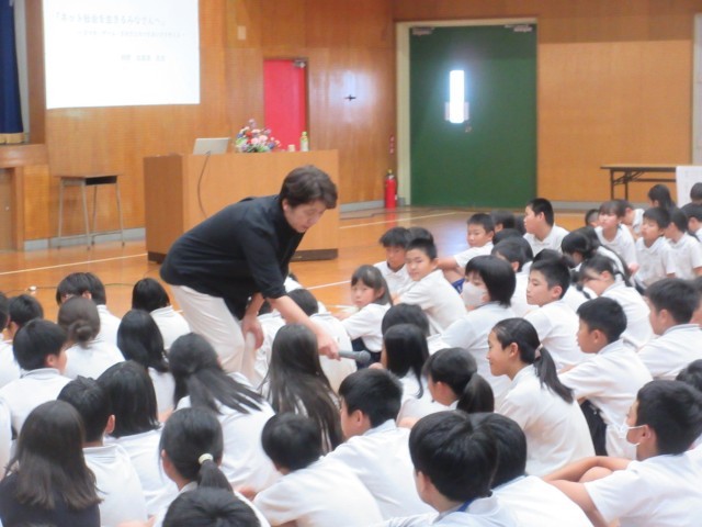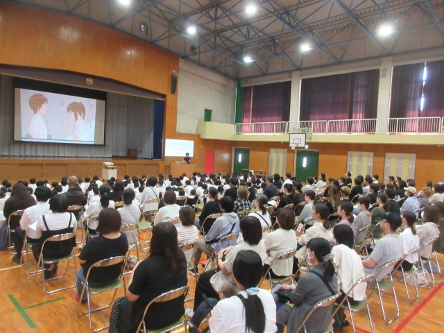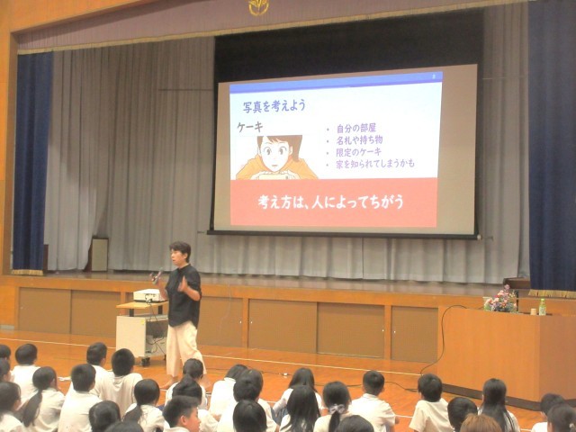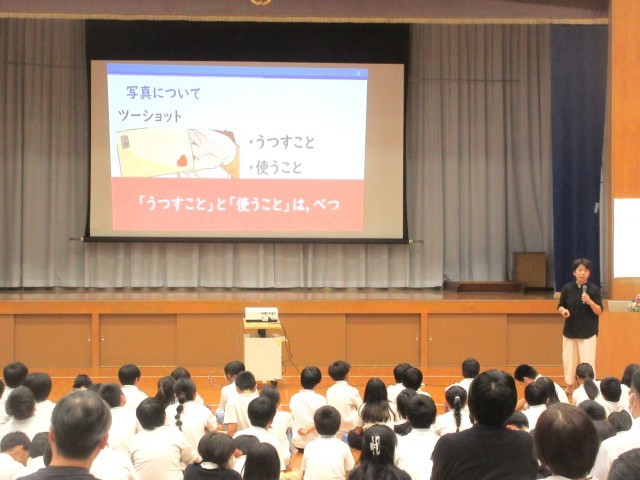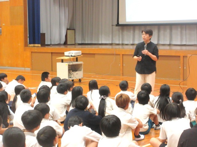 10/17(金)の参観日に、ネットモラルに関わる講演活動で県内外を問わず活躍されている桐野志摩美さんを講師にお迎えし、4年生以上の児童と保護者を対象に『ネット社会を生きるみなさんへ ~スマホ・ゲーム・SNSとのつきあい方を考える~ 』と題した講演会を実施しました。桐野さんは、スマホやSNSとのつきあい方について事例動画(アニメ)を視聴しながらその利便性に隠された危険性を子どもたちに問いかけ、自分事として考えることができるよう、わかりやすくお話をして下さっていました。子どもたちが退場した後も、短時間ですが参加した保護者の皆様に向け「大人の役割」として親としてやっておくべき大切なポイントについてお話をしていただきました。お話が短く感じられるほど充実した内容で、もう少し聴きたいなと思わせてくれる今回の講演会でした。桐野様、本日は遠方よりお越しいただき誠にありがとうございました。