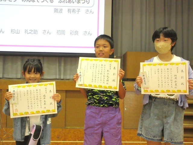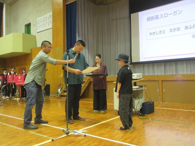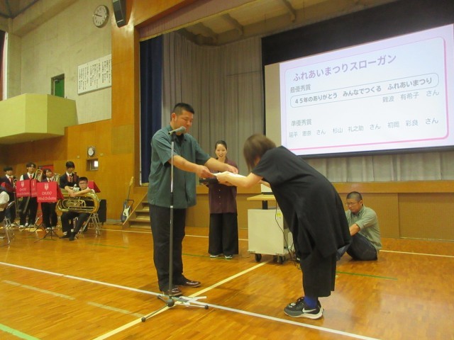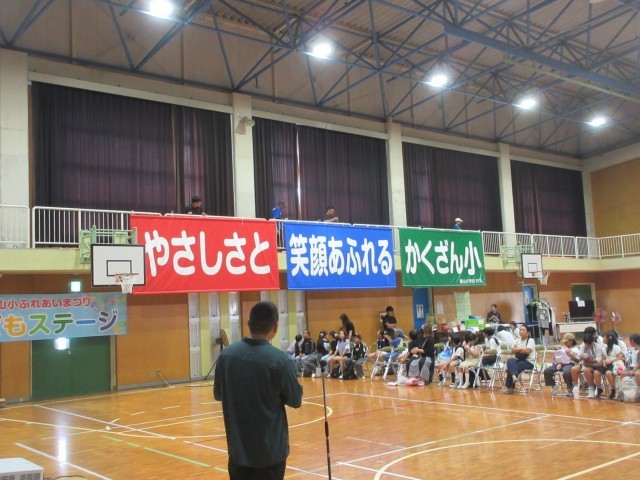10/18(土)鶴山小学校ふれあいまつりを開催しました。今年度は創立45周年ということで、オープニングセレモニーも各種標語やふれあいまつりスローガン募集に関わる表彰式、45周年記念クリアファイルの贈呈式、そして中道中学校吹奏楽部による演奏会等、賑やかな幕開けとなりました。