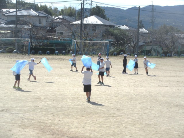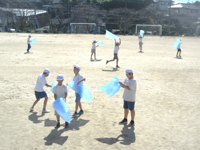 4年生が運動場で走りながらビニル袋に空気を集めていました。理科の『閉じ込めた空気の性質』についての学習単元で、集めた空気の体積や押し返す力の変化に着目し、押す力とを関係づけながら空気の性質を考えていく活動につなげていくそうです。実験等で自ら体験しながら学ぶことができるのが理科の良いところです。子どもたちはリラックスした良い表情で学習を楽しんでいました。