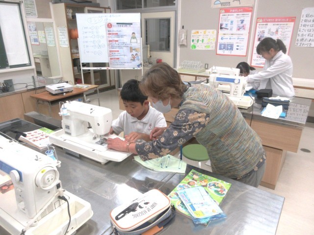 現在、5年生の家庭科で子どもたちがミシンを扱う授業を行っています。今年も地域のボランティアの皆様に来校いただき、子どもたちのミシン作業のサポートをしていただいています。子どもたちもボランティアの方々のアドバイスを真剣に聴きながらミシンで布を縫っていました。ミシンを扱うときの彼らの少し緊張した表情が印象的でした。