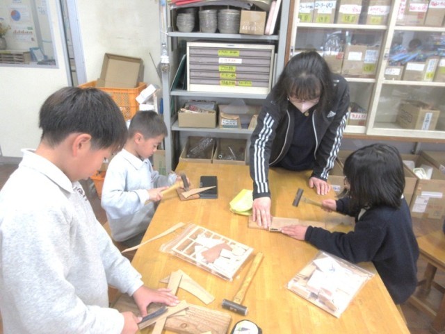 3年生が図工で釘打ちの活動を取り入れた制作物をつくっています。初めて金槌を持ち釘を打つ児童もいたようでしたが、ケガもなく楽しそうに トントン!カンカン!と音を立てながら各自で思い思いの作品をつくっていました。