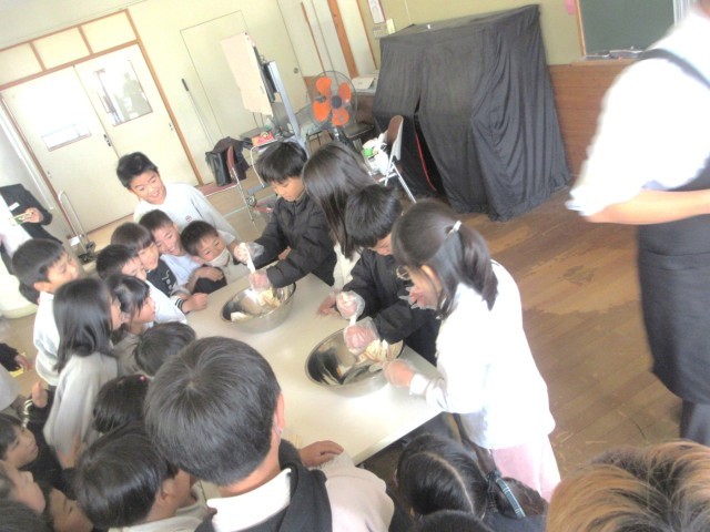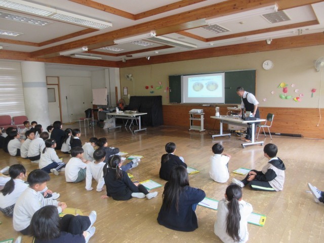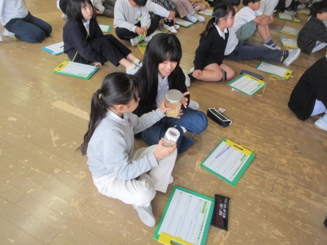 11/27(木)マルイ&大塚食品が実施する出前授業『プラントベースフードで学ぶSDGs~飲み物編~』を3年生が受講しました。SDGsの観点から近年の環境問題・人口食糧問題を絡め大豆を使用した食品や飲料に目を向け身近な食生活を考える内容の授業でした。3年生は畑のお肉と呼ばれる大豆を絞って豆乳とおからに分ける作業を体験しました。初めての体験に、代表して体験する子も周囲で見守る子も興味津々の様子でした。最後はお土産に2種類の豆乳をいただきました。豆乳を飲むことで結果的に健康や環境保護に繋がることを知り、大人も大変勉強になった時間でした。