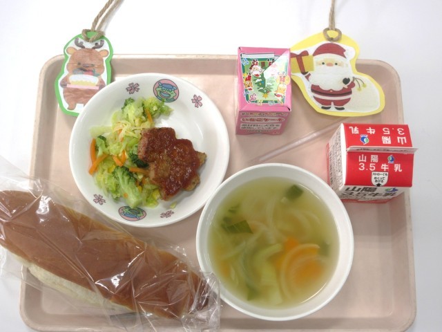 本日の給食は一足早くXmas献立でした!ツリー方のハンバーグに調理員さんが一生懸命くり抜いて下さったにんじんが入ったスープ、そしてかわいいケーキもついた特別メニューでした。ご家庭でも今日の給食のことを話題に出してもらえたらと思います。