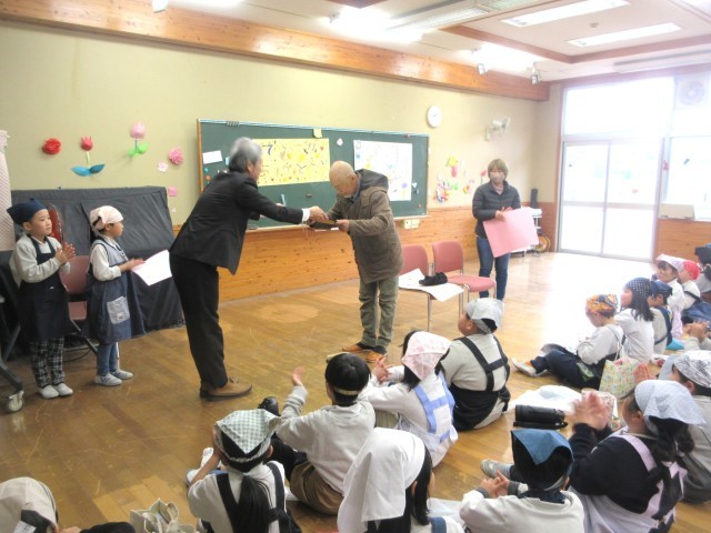 今年度、田植え・稲刈り体験を行った2年生が収穫したお米でおにぎりををつくりみんなで食べる『おにぎり集会』を開催しました。そして、ゲストに鶴山小学校に永年無償で田んぼを提供していただき、田植えや稲刈り体験の指導をして下さった志戸部在住の寺阪豊さんをお招きし、感謝状等もお渡しすることができました。給食(Xmas献立)を食べた後でしたが、それでも自分たちが刈り取ったお米でできたおにぎりは格別のようで、みんな美味しそうに頬張っていました。最後は保護者の皆様の前で「ありがとうの歌」を大合唱して終わりました。地域の方や保護者の皆様に見守られながら、お腹も心も満たされた素晴らしい会でした。
