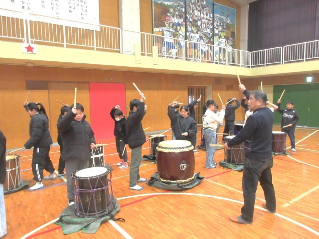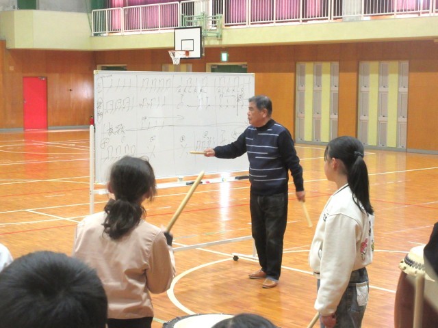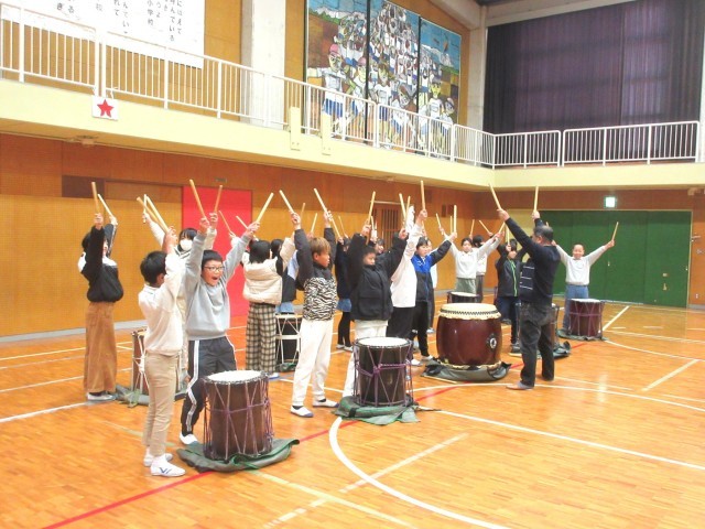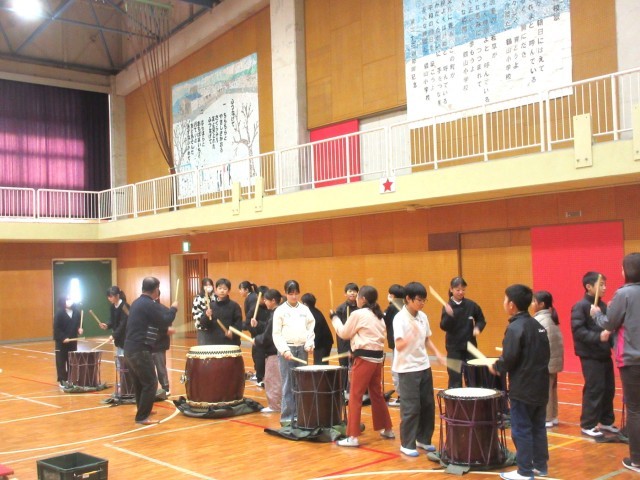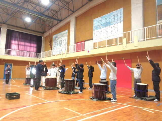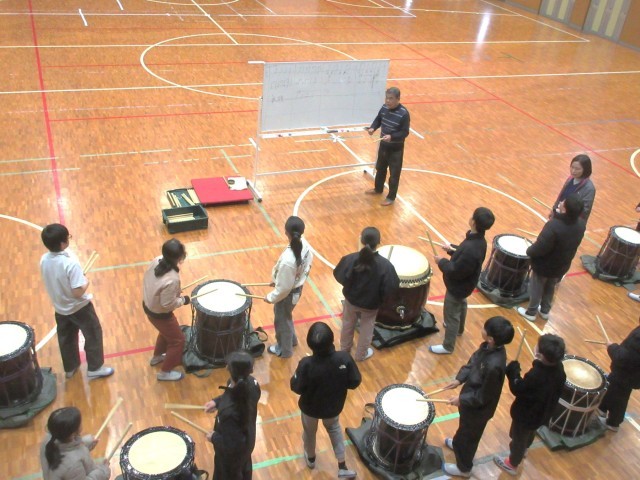 12/9(火)、5年生が和太鼓体験を行いました。1つの太鼓を2~3人で使い、講師の方の指導を受け、最後は和太鼓のリズムを取り入れ、鶴山小学校の校歌を歌いながら演奏しました。体育館は寒く、最初は防寒着を着て授業を受けていましたが、和太鼓を力強く叩き続けていくうちに体が温まり、途中で防寒着を脱ぎ出す児童もいました。力の限り和太鼓を叩き、力の限り大きな声を出していた5年生は、こちらが見ていても気持ちよさそうでした。