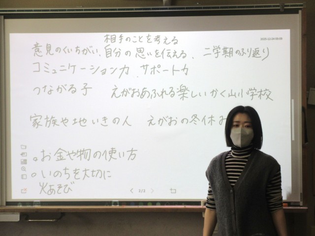 12/24(水)風邪・インフルエンザが流行中のため、2学期の終業式を各クラスへのリモート配信で行いました。子どもたちは、それぞれのクラスでしっかりとお話を聴くことができていました。長い2学期の間に経験した様々なことが子どもたちの成長の糧になってくれることを願っています。おうちでもお子さんに「今日、先生からどんな話があった?」と家族で2学期を振り返っていただけると有り難いです。