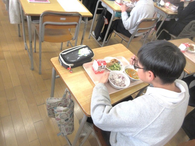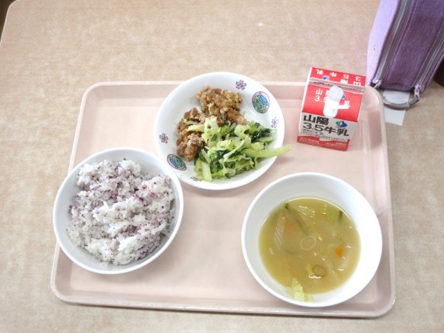 本日(1/20)の給食は、鶴山小6年2組が考えた献立でした。献立のタイトルは「冬野菜、栄養たっぷり献立」で、「赤じそごはん・鶏肉の唐揚げ・ほうれん草のごまあえ・冬野菜たっぷり汁・牛乳」といった内容でした。「みんな大好きな唐揚げや赤じそごはんを使ったり、旬の栄養たっぷりの野菜を使ったりしながら、五大栄養素を入れることをしっかりと考えて献立をたてました。」といったアピール放送が校内でも流れていました。6年2組の皆さん、とても美味しかったですよ!