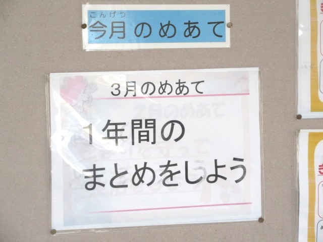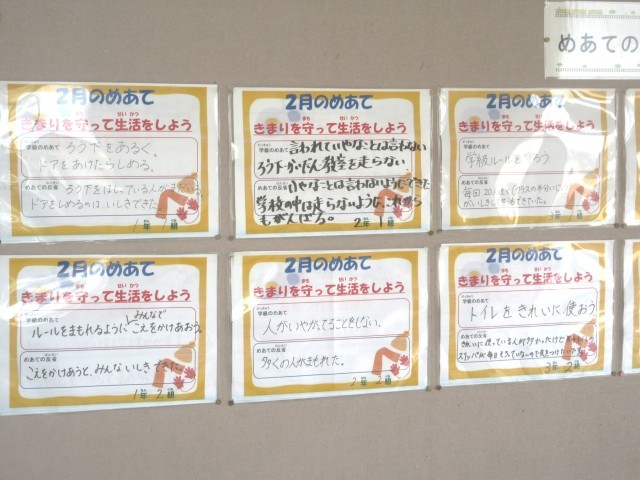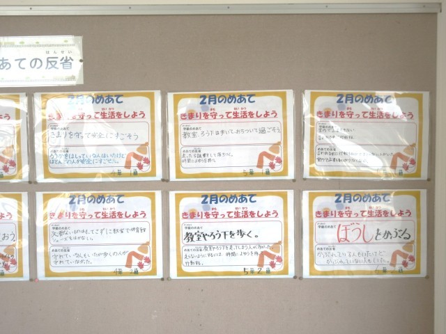 学校では月毎にくらしのめあてを提示し、各学級で取り組むようにしています。先月(2月)のめあては「決まりを守って生活しよう」でした。校舎内の掲示板には、各学級でのめあての振り返り・反省が掲示されているところです。今月(3月)のめあては「1年間のまとめをしよう」となっており、各学級で取り組む内容は任されています。今年度の良い締めくくりができるよう、どういったところにこだわって毎日を過ごしていくべきかをしっかりとクラスで共有し取り組んでいってほしいと思います。