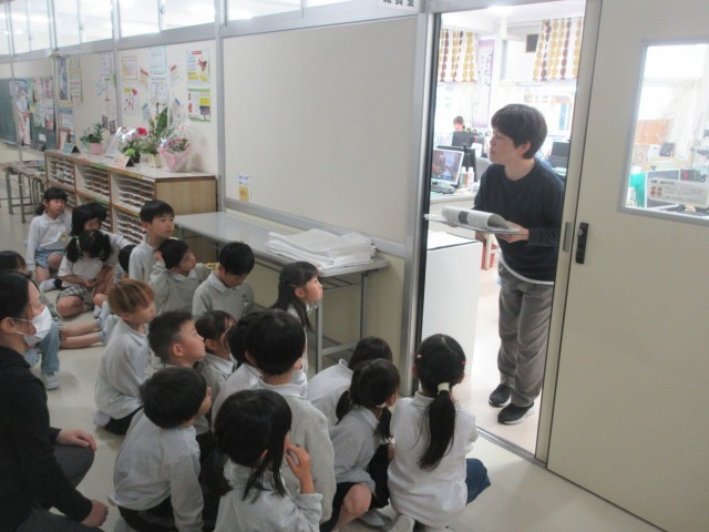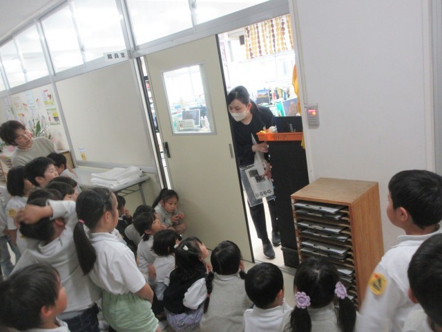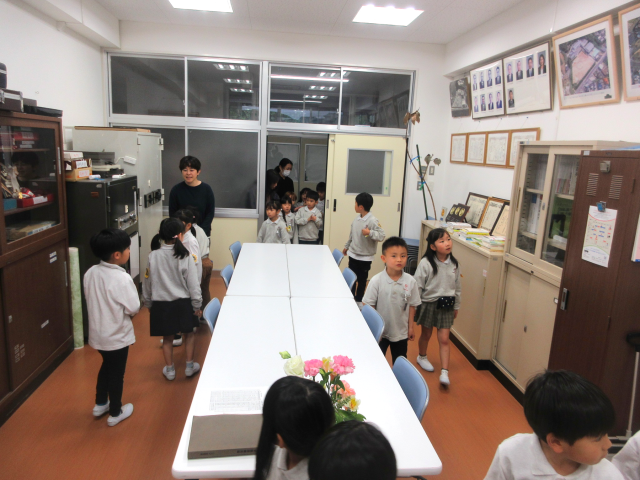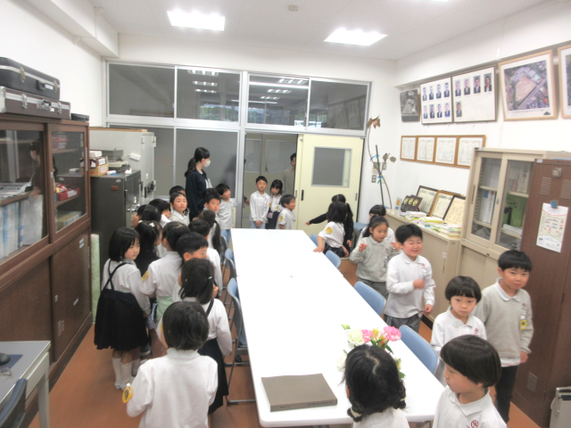 1年生が先生に連れられて学校探検を行っていました。保健室や職員室、その他特別教室等の説明や出入りの仕方も合わせて教えてもらっていました。校長室にも可愛い訪問者が訪れ、先生から説明を受けた後、部屋の中をぐるっと見て回っていました。なかでも歴代の校長先生の写真を見つけ「色が違う」「おじいちゃんみたい」「ここに今の校長先生おるん?」と素直な感想を言っている1年生の様子がとても可愛らしかったです。