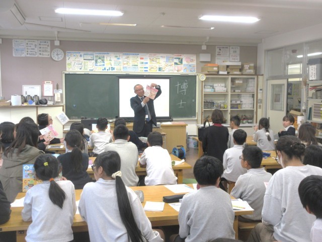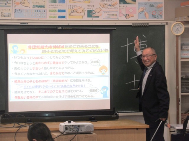 11/26(水)4年2組がPTA親学講座を図工室で開催しました。講師に本校の親学講座ではいつもお世話になっている津山市家庭教育支援チーム『はぴまる』の本多正寛先生をお迎えし、『非認知能力』についてのお話を子どもたちと保護者の方々にしていただきました。本多先生のお話や問いかけに対する子どもたちの反応が素晴らしく、本多先生からもお褒めの言葉をいただきました。今回で今年度の親学講座は最終となります。本校における親学講座の半分以上を担当して下さった本多先生、今年も大変お世話になりました。ありがとうございました。
